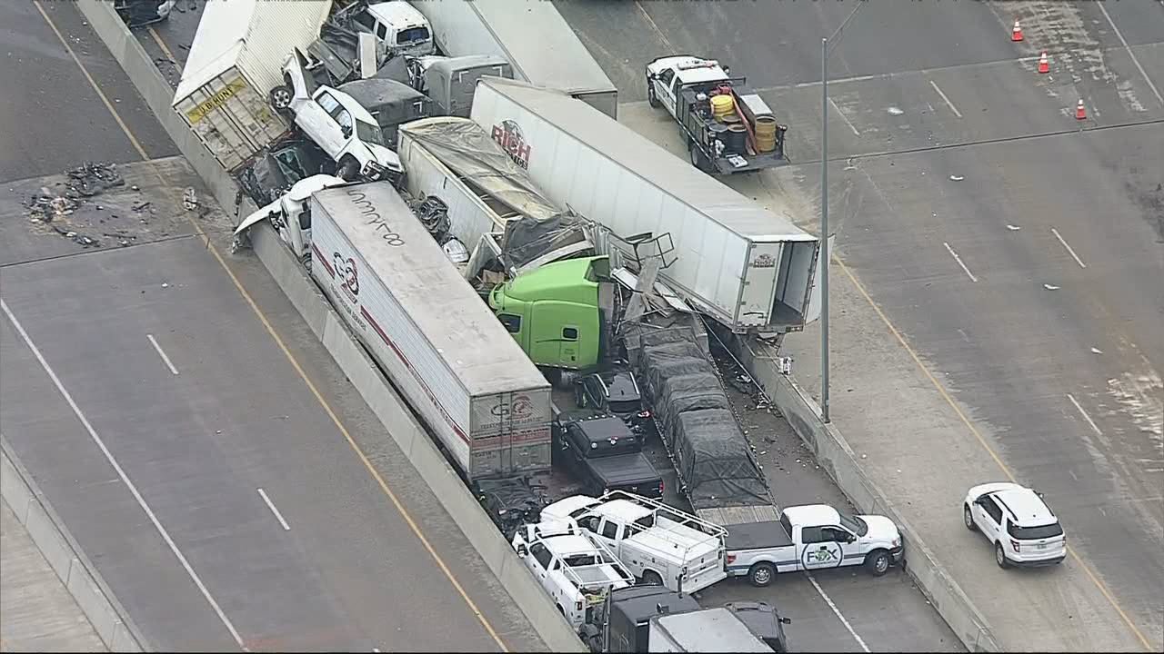Aerial footage of deadly pileup crash in fort worth texas involving 75 to 100 vehiclesofficials estimate as many as 100 vehicles were involved in.